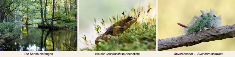 Du kannst den Bussard in den Feldgehölzen auf seinem Ansitz beobachten, Mehlschwalben bei der Fütterung ihrer Jungen, Eidechsen beim Sonnenbad und unzählige kleine Frösche und Kröten bei ihrer Wanderung. Weithin ist das Zirpen der vielen Heuschreckenarten zu vernehmen, der Gesang der Kraniche in den Morgenstunden und die Rufe der Waldkäuze in der Abenddämmerung. Neuer Liebling ist ein neugebores Kälbchen von Mama-Kuh "Hörnchen" aus der Mutterkuhhaltung von Fam. Scheel.